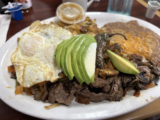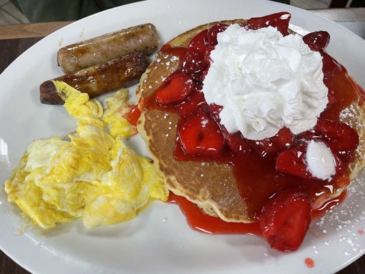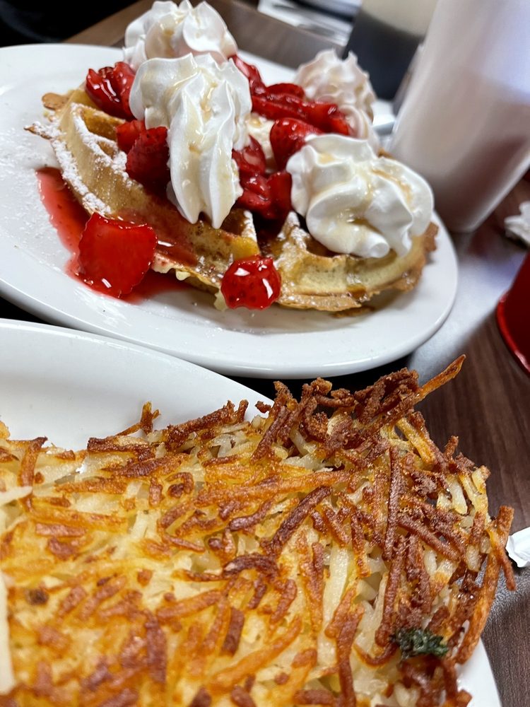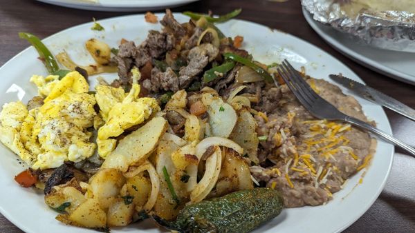 First time here for my husband and I. We shared the ribeye steak breakfast and had a pancake instead of toast. Steak was big and cooked perfectly. Home fries were really good too. Pancake was amazing.